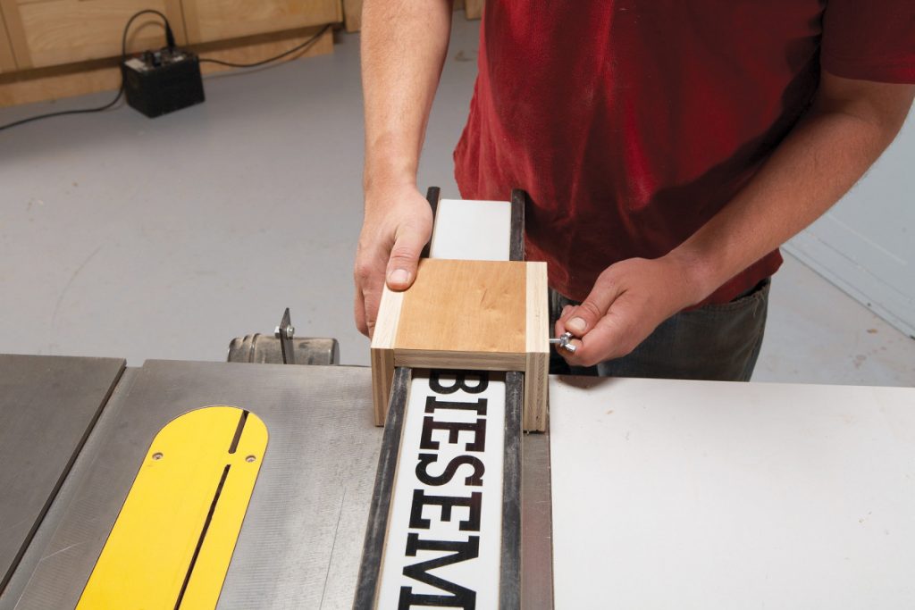 Here’s a no-frills, adjustable block for making stopped cuts. Cut three pieces of 3/4″ plywood sized to fit your tablesaw’s rip fence. Install a T-nut in one of the side pieces before assembly. Thread a short piece of threaded rod …